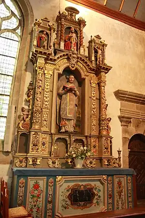 This was designed by G. Carquain in the 17th century and shows Saint Anne with the Virgin Mary in the centre. On the right of this is a depiction of Saint Joseph, and on the left Saint Joachim. Top left is Saint Barbara, top centre a bishop and top right Saint Marguerite. Along the bottom of the altarpiece, and from left to right, we have a depiction of the "rich", then Saint Yves followed by Saint Hervé and Saint Cadou.