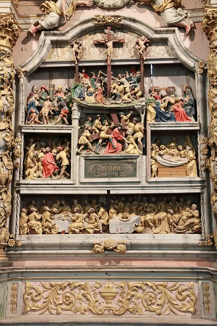 This altarpiece dates to the 17th century. In the top right hand section there is a depiction of Saint Miliau, the patron saint of Guimiliau, and below a scene showing his martyrdom when he was beheaded by his brother Rivode. The left hand side has an image of the bishop of Léon and below that a depiction of the Virgin Mary's birth. The central section was supplied by an Antwerp workshop and in eight magnificent tableaux, the sculptors have created 80 images representing the story of the passion. At the very bottom the scenes presented are of the Last supper and Jesus washing the disciples' feet and in the other sections, we see representations of Judas' kiss, the flagellation, Jesus carrying the cross, the descent from the cross, the entombment and the altar of the passion itself.