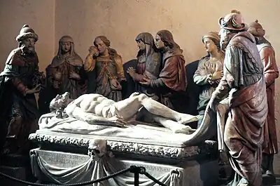 This remarkable sculptural work dates to 1676 and recreates Jesus' followers preparing his body for burial after its removal from the cross. The followers include Joseph of Arimathea, Nicodemus, Gamaliel, the Virgin Mary, John the Evangelist, Mary Magdalene, Mary the mother of James and Mary Salome (disciple). The sculptor was Antoine Chavagnac. Chavagnac was a sculptor to the French Navy in Brest.