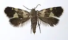 The wingspan is about 12 mm. The head is fuscous. Forewings dark purple-fuscous ; a sometimes interrupted fascia about 1/4, a subquadrate costal spot beyond middle, and a larger triangular dorsal spot before tornus yellow ; tips of apical cilia whitish. Hindwings dark fuscous.[1] Adults are on wing from May to July and fly in afternoon sunshine.