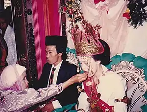 ![]() A Lampung bride and bridegroom in 1987. Both of the couples are of the Sungkai Bungamayang clan. The traditional headgear of the bride, which is called Siger, is commonly used in Lampung weddings. | |