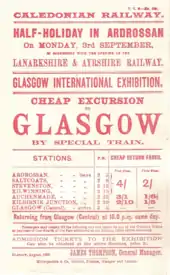 - ↑ Sources are contradictory about the timing of the main authorisation. Paterson, page 133 says that the £375,000 and the Ardrossan line were in the 1884 Act; Carter (page 457) implies it was the capital of the 1883 scheme; Ross is ambiguous on the timing of the main authorisation (on page 122) but says that the Act of 16 July 1885 authorised it "to invest up to £150,000 of the £375,000 capital". Paterson, referring to the 1884 Act, says that "all but £15,000 of the capital required [was] subscribed without Caledonian help."