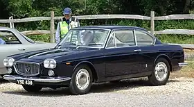 The Lancia Flavia was developed by Antonio Fessia in the late 1950s, and introduced for sale in the UK in 1961. Initially available only as a four-door saloon, it featured a 1.5 L aluminium boxer engine, Dunlop disc brakes on all four wheels, front-wheel drive, and front suspension by unequal-length wishbones.[5] This model was soon joined by a two-door coupé, designed by Pininfarina on a shortened platform. Vignale built 1,601 two-door convertibles, while Zagato designed an outlandish-looking lightweight two-door "sport" version.[6] Only 626 of the Zagato-bodied models were built, plus three prototypes. Ninety-eight were 1500s and the remaining 512 received the larger 1800 engine.
