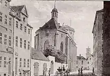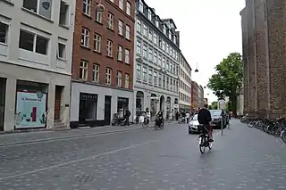 The street was from 1798 home to a row of small shops which were established along the wall that surrounded Trinitatis Church's graveyard to create an extra income for the church. They sold various goods, including tea and coffee, porcelain, stockings and bread. The wall was demolished and the shops removed in connection with a renovation of the church in 1817.[3] The main entrance to the church was also moved from its south side to its current location on Landemærket. The last block of the street, from Aabenraa to Gothersgade, was called Slippen until 1887.
