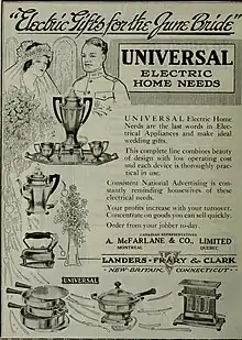 Landers, Frary & Clark was a housewares company based in New Britain, Connecticut.[1] The firm traced its origins to 1842, when George M. Landers and Josiah Dewey entered into a partnership named Dewey and Landers, which manufactured various metal products.[1][2] Eventually, the company was reorganized as Landers, Frary & Clark in 1862.[1] The firm produced a variety of household products and appliances, including many electric appliances.[1] Some of Landers, Frary & Clark's most successful products included the Universal Bread Maker, the Universal Food Chopper, and the Coffee Percolator.[1] In 1965, the majority of the Landers, Frary & Clark was taken over by the J.B. Williams Company of New York, the food chopper division was acquired by the Union Manufacturing Company, and the electrical appliance operations was purchased by General Electric.[2]