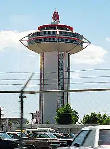 Construction had reached the 26th floor by the end of April 1962. Upon completion of the floor, work was to begin on the tower's bubble dome.[5] By June 1962, ABCC loaned an additional $300,000 to Caroll, who reached his $3 million loan limit with the company.[37][38] Caroll ultimately owed ABCC a total of $3.5 million.[39] In August 1962, the Landmark tower was designated as a civilian fallout shelter, with the capacity to hold 3,500 people after its completion.[40] That month, work was underway on the steel framework base for the tower's glass bubble dome.[41]