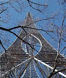The most well known example is the Star Tower, located in Cincinnati, Ohio. The individual base leg columns were erected by crane, while the upper sections of the tower were built using a Sikorsky S-64 helicopter.[4] Numerous other Landmark towers can found across the United States, including the Mesquite Tower in Mesquite, Texas, the Hughes Memorial Tower in Washington, D.C., and, at a smaller scale, WPXR-TV's analog antenna on Poor Mountain in Virginia, and another atop the Energy Plaza skyscraper in downtown Dallas, used by TXU Energy for its communications needs. None are known to have been built outside of the United States. The Adelphon Tower Company (Henry McGinnis) wrote bankruptcy on Prime Contractor Pyramid Tower & others in 1991 as Star 64 was completed. Many others were listed in the Chapter 7. The Landmark Tower Company went bankrupt as Henry's wife attempted to continue after Henry McGinnis passed on in 2002.[5]