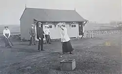 The Dunlop Golf Club Course had nine holes and was at first located at Hapland in 1908 but moved to Templehouse in 1909 where it remained until closure in 1922. The ground was reported to be "of a sporting character, being varied and undulating. It is about a twelve minute walk from the station, and about two miles from Stewarton. The membership fee of 10 shillings for gentlemen and 5s for ladies is very moderate. In 1914 the secretary was J H Marr, 2 Mansfield Terrace. A 9 hole course situated on Templehouse Grounds with a membership of 150. There was no entry fee. Subs were 12/6d. Visitors’ fees were 1/- a day and 2/6d a week. Sunday play was not allowed." The only remains are that of a bunker that overlooks the ruins of Templehouse.[22] It operated from 1911 through to 1915 and at the AGM the freedom of the course was granted to all military personnel, nurses and staff stationed at the Dunlop House Military Hospital; in addition they decided to retain the membership of those members serving in the Forces.[23] A bunker may still survive at the site of a small whinstone quarry near the old house ruins.