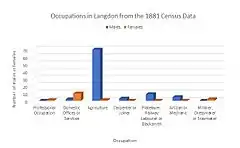 The 2011 census recorded 281 males and 277 females, and 424 residents aged 16–74 who were employed.[14] The number of women engaging in economic activity has significantly increased since 1881, in 2011 a total of 216 women were in employment.[15] The number of males engaging in economic activity in 2011 was 208, employment between males and females in Langdon is now very similar, compared to the 1881 statistics where economic activity was mainly dominated by males.[16]