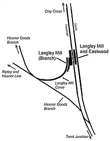 The line came into being as competition for the GNR's branch. It was completed as far as Heanor by 1890, but took another five years to reach Langley Mill where it joined a line called the Heanor Goods Branch which actually connected to a Butterley Company line to a group of collieries around Heanor.[3] It then passed along a short tightly curved spur to reach the platform with its own waiting room and toilet. A runaround loop was provided but no means for turning.[4]