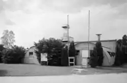 The three Quonset huts sat side by side.[2] All three were constructed from prefabricated corrugated steel panels placed horizontally over arched steel ribs and purloins. The huts were eighteen by forty-eight feet, with a center height of eleven feet. Each hut had a single door on the end, and eight windows, four on each side, measuring 31 by 39 inches. The windows were hinged at the top of the frame and open from the bottom.[3]