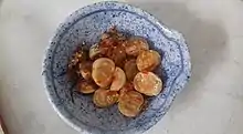 The Lao eggplant (Lao: ໝາກເຂືອ, pronounced [mȁːk kʰɯ̌a̯]), also known as Lao aubergine, is a local variety of eggplant found in Laos and used primarily in Lao cuisine. Research indicates Laos to be home to a wide diversity of eggplant landraces with variation in fruit shape, color, and the presence or absence of spines.[1] Common cultivar types in Laos are Lao Green Stripe, Lao Purple Stripe, Lao Lavender, and Lao White.[2] They are usually round and roughly the size of a golf ball.