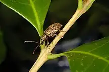 Adults are apterous and during the day they remain hidden, mostly buried. They come out at night to eat vegetation and copulate. The notches they leave in the leaves of trees and bushes are characteristic and serve to indicate the presence of these weevils, which are abundant and whose generic name in Spanish is "chascones". The females lay between 100 and 300 eggs (a record 1710 eggs) in clusters that they hide in crevices. Larval development lasts between 4 and 6 months but can continue up to a year if they enter diapause. The larvae are free-living and feed on plant roots. Adults live for 2 to 6 months[4]