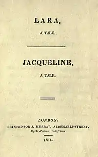 Lara, A Tale was first published anonymously by Lord Byron in 1814 alongside another poem that was not written by Byron. In this version, there is nothing to distinguish between Lara and Jacqueline (written by Samuel Rogers), as they were published anonymously and without any indication that there are two separate authors within the text. This tragic narrative poem is seen as a continuation of another poem of Byron's, The Corsair. It details Count Lara's return home after spending a few years travelling abroad. With a page as his only company, Lara's story continues as he encounters problems with his fellow men. First, this leads to a duel that Count Lara ends up winning and as the story progresses, he must also fight both friends and foes. Count Lara is successful in his battle against all odds, until one night he encounters a large group and attempts to fight them. Unfortunately, he is mortally wounded in the process and dies at the end of the poem.