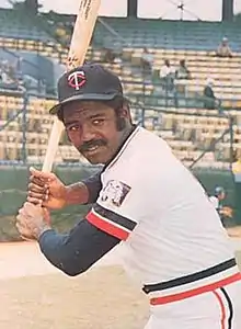 In a spring training game for the Minnesota Twins on March 6, 1973, Hisle was MLB's first designated hitter; in five at bats, he hit two home runs (one of them a grand slam) and had seven RBIs.[3][4] A month later, Ron Blomberg of the New York Yankees would become the first DH in a regular-season game. That year, Hisle hit .272 with 15 home runs. He remained a reliable member of the Twins' lineup throughout the mid-1970s, and hit for the cycle on June 4, 1976.[5] Hisle's best season with the Twins came in 1977, when he hit .302 with 28 home runs and an AL-leading 119 RBIs, as well as being named to his first All-Star Game.