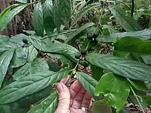 The flowers are produced in the leaf axils and are about 10 mm (0.39 in) in diameter with 4 or 5 white petals.[5] The fruit is an ovoid drupe up to 16 mm (0.63 in) long by 12 mm (0.47 in) wide, dark blue or blackish, with the green calyx persitant at the apex.[4][5] Fine hairs cover the outer surface, giving it a shiny appearance.[5] They usually contain four seeds about 6 mm (0.24 in) long by 3 mm (0.12 in) wide.[4][5]
