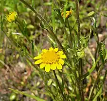Atop the stem is an inflorescence, which is a flower head with a base of hairy phyllaries. The head contains many yellow disc florets surrounded by a fringe of several short ray florets, which are usually also yellow.