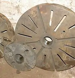 The faceplate was the ancestor of lathe chucks, an arrangement of three or more adjustable 'dogs' bolted to the faceplate providing a primitive chuck arrangement. The smaller plate in the upper photo is specifically a 'dog face' with slots intended to hold a bent tail dog while the work itself was supported on centers. The larger plate to the right simply provides a variety of ways by which work can be bolted or clamped to the plate. The slotted plate on the lower photo accepts wedged holders which can be used to fasten the work to the plate. The plates were expendable, so it was not unusual as shown in both photos for a machinist to drill additional holes in the plates for attaching work that could not otherwise be attached. While the dog plates were usually fairly small regardless of the lathe size, the classic face plate is usually matched to the maximum diameter that the lathe will swing.