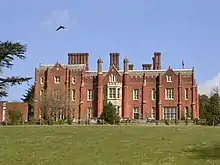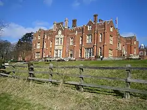 Latimer House, a mansion on the hill on the edge of the village, was once a home of members of the Cavendish family who became the barons Chesham. During the 17th century, Latimer Manor was the home of Christian Cavendish, Countess of Devonshire, then later of William Cavendish, 3rd Earl of Devonshire, and his wife, the former Elizabeth Cecil because Chatsworth House had been sequestered by Parliament. Their daughter, Anne Cecil, Countess of Exeter was born at Latimer and would later marry John Cecil, 5th Earl of Exeter, known as Lord Burghley, and would go living at Burghley House. During the 18th century, the Manor was lived in by the wife of Elihu Yale, Catherine Hynmers Yale and their daughter, Ursula Yale. Both are buried in the small church on the estate. They rented the estate from their son-in-law Lord James Cavendish, son of the 1st Duke of Devonshire, and husband of Anne Yale.[2] The 3rd Baron Chesham was a commander in the Boer War.[3] The original Elizabethan house, where Charles I was imprisoned in 1647 and Charles II took refuge before fleeing abroad, was gutted by fire in the early 1830s and the present red brick Tudor style mansion, which was designed by Edward Blore, was completed in 1838.[4]