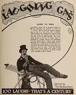 Laughing Gas is a 1914 film starring Charlie Chaplin. The film is also known as Busy Little Dentist, Down and Out, Laffing Gas, The Dentist, and Tuning His Ivories. It is inspired by the 1907 film with the same name.