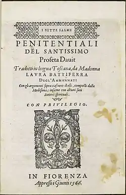 Laura Battiferri (1523–1589), also called Laura Battiferri Ammannati, was an Italian poet during the Renaissance period. She was born in Urbino, Marche, Italy as the illegitimate daughter of Giovanni Antonio Battiferri from Urbino and Maddalena Coccapani from Carpi, Emilia-Romagna. She published two books of poetry: The First Book of Tuscan Works (Florence, 1560) and The Seven Penitential Psalms… with some Spiritual Sonnets (Florence, 1564). She died in 1589 while compiling a third, Rime, which was never published. She married the sculptor, Bartolomeo Ammannati in 1550 and they remained married until her death and they had no children.