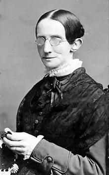 In 1837, James Barrett of Dartmouth College saw Bridgman and mentioned her case to Dr. Reuben Mussey, the head of the medical department. Mussey visited the Bridgman home and found Laura an affectionate and intelligent girl who, despite her severe disabilities, could perform basic household tasks such as sewing and setting the table.[7] Mussey sent an account to Dr. Samuel Gridley Howe, the director of the Perkins Institution for the Blind in Boston, who was eager to educate the young Bridgman.[8] Bridgman entered the school on October 12, 1837, two months before her eighth birthday.[9][10] Bridgman was frightened and homesick at first, but she soon formed an attachment to the house matron, Miss Lydia Hall Drew (1815-1887), who was also her first instructor at the school.[11]