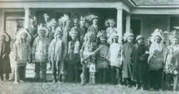 Keetoowah Nighthawk Society leaders Redbird Smith and Bluford Sixkiller instructing children in Cherokee rituals, 1921