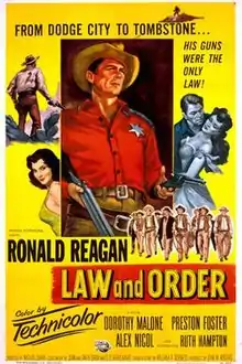 Law and Order is a 1953 American Western film directed by Nathan Juran and starring Ronald Reagan, Dorothy Malone and Preston Foster.