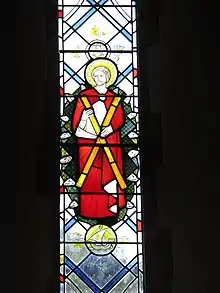 Lee also paid homage to his military career making several contributions to the Royal Military Academy Chapel at Sandhurst. This includes about 26 windows by Lee installed over the years between 1954 and 1991. These include small heraldic windows commemorating the field marshals of the Second World War.[3][13] Other work from the early 1950s includes four windows in the south wall of St Magnus-the-Martyr in the City of London. These depict St Magnus of Orkney, St Margaret of Antioch, St Thomas of Canterbury and St Michael - the latter dated 1954.[2][13]