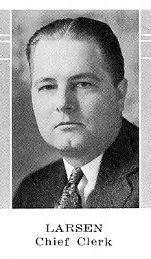 Larsen was originally involved in politics as a member of the Democratic Party. He was chosen as chief clerk of the Wisconsin Senate in the 1935 session, when the Democrats briefly held control of the chamber in a coalition with Wisconsin Progressives.[4] He was subsequently retained as chief clerk when the Progressives took the majority in 1937, and when the Republicans took the majority in 1939, remaining in office until the end of the 1945 session.[5]