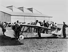 Wackett later transferred to No. 3 Squadron AFC in France and played a significant role in the Battle of Hamel fought on 4 July 1918. Captured German documents revealed that they had been experimenting with dropping ammunition from aircraft and No. 3 Squadron was asked to investigate doing the same. Wackett was asked to do the work as his reputation had spread; 'he had a gift for mechanical inventions' according to his superiors.[5] Now a captain, he devised a small parachute that could be used to drop supplies to troops, designed a modified bomb rack to hold the supplies and then trained No. 3 Squadron personnel in the required technique. General Monash's battle plan for Hamel involved resupplying the engaged machine-gunners with ammunition dropped by aircraft. In the event No. 3 Squadron was assigned other tasks during the battle and the ammunition dropping was performed by No. 9 Squadron RAF. Monash later wrote, "at least 100,000 rounds of ammunition were [dropped] during the battle with obvious economy in lives and wounds. The method thus initiated became general in later months".[3][8] Later that year, on 25 September, Wackett undertook a daring reconnaissance mission in 3 Squadron's first Bristol F.2 Fighter, when he penetrated six miles (10 km) behind enemy lines to take aerial photographs of the German Joncourt-Villers Outreaux line, that were needed for a forthcoming attack.[5] Two days later he carried out an ammunition resupply flight to some isolated troops using the equipment he had designed. As a result of these two actions he was awarded the Distinguished Flying Cross.[9] By the end of the war two months later he had been promoted to the rank of major. On 6 January 1919 he was appointed the Commanding Officer of No. 7 Squadron AFC based at Leighterton in England. 7 Sqn. had acted as the training unit for No. 3 Squadron during the recent conflict and Wackett remained the CO until the Squadron was disbanded in March that year, at which time he returned to Australia.