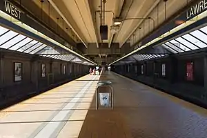 Lawrence West is a subway station on Line 1 Yonge–University in Toronto, Ontario, Canada. It is located in the median of William R. Allen Road at Lawrence Avenue West. The station serves the local communities of Lawrence Heights, Lawrence Manor and Glen Park, and nearby destinations such as the Columbus Centre, Lawrence Heights Community Recreation Centre and Lawrence Allen Centre. Wi-Fi service is available at this station.[3] The station has a Gateway Newstands in the paid area of the south side area.