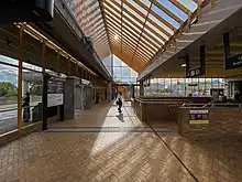Upon entrance from the Lawrence Avenue bridge over Allen Road, the bus waiting area and the train platform are apparent. This openness is achieved through glazed walls and a large stairwell.[12] The glass is framed with distinctive orange-painted metal. The platform level features exposed concrete walls, with a long strip of skylights above the tracks with the same orange framing used throughout the station. Rectangular prism benches with rectangular tiles of yellow, orange, and brown hues are unique to the station. Similar tiles are used on the floors and centre pillars.
