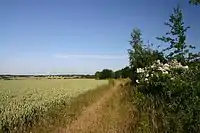 - Ancient rolling farmlands - This is a rolling arable landscape of chalky clays and loams. The enclosure over a lot of the landscape retains much of the organic pattern of ancient and species-rich hedgerows and associated ditches. There are however some areas of field amalgamation and boundary loss, especially on the interfluves between the small valleys. The settlement pattern is dispersed farmsteads of mediaeval origin interspersed with some larger hamlets and occasional villages. The farms are large but are mainly owner-occupied rather than estate owned. The hedgerow trees are of typical clayland composition: oak, ash and field maple, with suckering elm. Although there are some areas of extensive field amalgamation, overall the landscape is largely intact, and accessible thorough a dense network of winding roads with wide verges.[54]