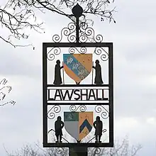 In June 1991, the village sign was unveiled. The design represents Lawshall's links with the Abbey of Ramsey shown by the arms of the abbey flanked by two monks. In 1547, the Manor of Lawshall was sold to the Drury family and the lower shield shows the coat of arms of the Drury family and also the Hanningfield family.[2]