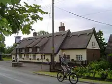 In the nineteenth century there were seven public houses or beer retailers in the parish.[2] The one remaining pub, The Swan Inn, is an eighteenth-century timber-framed and plastered building, previously with an L-shaped plan with a front extension at right angles to the road. This front extension was demolished in 1968 when the building was renovated. The roof is thatched with three dormers.[10] Coins nailed to the underside of the timber beams in the public bar, are from a custom of soldiers during World War I to nail up coins in this way and to reclaim them upon their return. Their current day presence reflects the loss of 24 men from the village.[2]