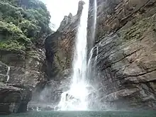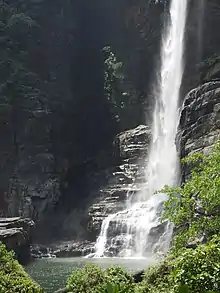 Laxapana Falls is 126 m (413 ft) high[1] and the 8th highest waterfall in Sri Lanka and 625th highest waterfall in the world.[2][3] It is situated in Maskeliya area in Nuwara Eliya District, about 16 km (9.9 mi) from Maskeliya town on Maskeliya-Norton Bridge road, in a village called Kiriwan Eliya. It is formed by Maskeliya Oya near the confluence of Kehelgamu Oya and Maskeliya Oya which forms Kelani River.[4] The falls gives its name to twin hydroelectric power stations, Old Laxapana Power Station which generates 50 MW of electricity and New Laxapana Power Station which generates 100 MW.