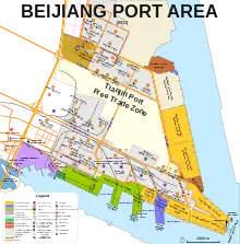 The Beitang Port Area (Chinese: 北塘港区; pinyin: běitáng gǎngqū) lies on both sides of the Beitangkou estuary. At present it is limited to several small barge wharves, but it is planned to expand as part of the development of the Binhai Tourism Area. There are two service wharves planned, 230 m and 150 m in length, plus a large environmental monitoring base, passenger terminal, construction materials wharves and yachting marina. The Beitang Fishing Harbor is directly north, inside the river estuary.