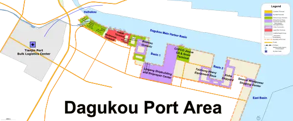 The Port of Tianjin is divided into nine areas: the three core ("Tianjin Xingang") areas of Beijiang, Nanjiang, and Dongjiang around the Xingang fairway;[1] the Haihe area along the river; the Beitang port area around the Beitangkou estuary; the Dagukou port area in the estuary of the Haihe River; and three areas under construction (Hanggu, Gaoshaling, Nangang).