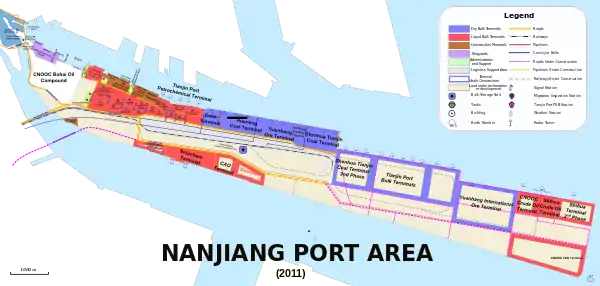 Nangang Port Area (Chinese: 南港港区; pinyin: nángǎng gǎngqū) is being built on the reclaimed land of the TEDA Nangang Industrial Zone (天津开发区南港工业区), south of the Duliujian river and north of the Ziya river. It will focus at first on petrochemical goods. The first trial wharf opened in 2011.