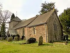 The Grade I parish Church of St Andrew (grid reference SO5684263253), is church of local sandstone, of chancel, nave, west tower, and south porch. It dates to the 12th century, with the chancel and tower from the 13th. The church was restored in the late 19th century when a south porch and organ chamber were added, and the chancel south wall rebuilt. A stone slate roof was added in the 20th century. The tower is of three stages and llancet windows are topped with a pyramidal roof; the bell stage contains three bells. The nave at the south contains a 19th-century two-light traceried window either side of the porch, and the same on the north. Between the nave and chancel is timber chancel arch. The chancel south side shows a blind doorway beside a 19th-century trefoil headed window. The east window, also 19th century, is of three lights and traceried. The nave roof, under the 20th-century tiles, is of 14th-century trussing. The trussed chancel roof dates to the 17th century and, on its north side is an arched recessed organ room. The interior contains a 12th-century bowl font which might have originally come from Pudleston. Wall monuments date to the early 18th century, with a floor ledger slab dated 1644.[4][34][41][42][43]
