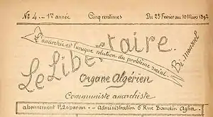 On 27 January 1892, Jean Faure published Le Libertaire in Algiers.[8][9] It was described as an "Algerian communist anarchist organ" (une organe algérien communiste anarchiste). Seven issues were produced and distributed across the French north African Littoral, from Oran to Sfax.[10][11]