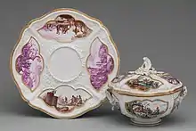 Le Nove porcelain was made in the 18th century in the town now called Nove, near Bassano, then in the Republic of Venice's mainland territories, the terrafirma. It was made at a factory owned by Pasquale Antonibon, who was already making fine maiolica in fashionable styles, which continued to be made alongside the porcelain. Production of porcelain began in 1762 and ended when Antonibon died in 1773. But it resumed in 1781, when Francisco Parolin (or Parolini) leased the factory for twenty years in a partnership with the Antonibons, known as the "Parolin period".[1][2] This lasted until 1802.[3] Production of porcelain continued intermittently until 1835.