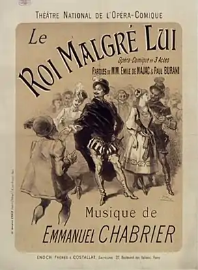 Le roi malgré lui (King in Spite of Himself or The reluctant king) is an opéra-comique in three acts by Emmanuel Chabrier of 1887 with an original libretto by Emile de Najac and Paul Burani.[1] The opera is revived occasionally, but has not yet found a place in repertory.