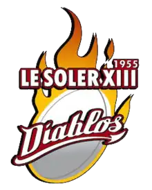 Founded in 1955 as RC Le Soler XIII by Noel Amoros and Pierre Aspaillange the new club reached their first league title final in 1959 when they finished runner-up to RC Salon XIII in the 2nd Division now called the National Division 1 league, losing by 10-21. The following season they finished runner-up again this time in the regional Rousillon League. It was during the early 1980s that the club enjoyed their best spell. Under player-coach Cesar Rodriguez the club not only produced future top flight players like Jacques Jorda, Michel Charcos, Antoine Gonzalez and their own captain at the time Jo Bruzy they also enjoyed on the field success with these players. In season 82/83 they convincingly won the Federal Division nowadays called the National Division 2 thrashing RC Lescure-Arthes XIII in the final 47-0. Season 83/84 brought continued success as they went on to lift the National 2 title after beating Saint-Paul Fenouilledes XIII in the final 16-10 and winning promotion to the 2nd tier. During this season they also embarked on their best Lord Derby cup run. After despatching Palau XIII Broncos, top tier club Limoux Grizzlies and Pennautier XIII in the group stages they went and beat top flight club SM Pia XIII in the Quarter-Finals. At the Semi-Final Stage they were drawn against the current champions and powerhouses XIII Catalan. The game was played at the Stade Aime-Giral in Perpignan in front of a crowd of 5,000 and the minnows from the 3rd tier Le Soler did themselves proud in only going down 5-15. There then followed some fallow times including a couple of relegations and by the new millennium the club was struggling both on and off the field. In 2008 the club closed down but was quickly reformed under a new name Le Soler XIII. a new board was announced and the club colours were changed from the original red shirts and yellow shorts and socks (Catalan colours) to black and white hoops. The old colours remain on the club logo. In 2010 the newly reformed club won the National Division 2 Languedoc-Rousillon League and in 2011/12 they went one better and won the overall National Division 2 title beating US Trentels XIII 23-12 earning promotion in the process. After a couple of struggling seasons in the National Division 1 they were relegated back to the 4th tier.[1]