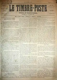 Le Timbre-Poste was the first French language philatelic magazine. It was published by Jean-Baptiste Moens of Brussels from 1863 to 1900. Le Timbre Fiscal was included as a supplement from volume 17 of 1879 and incorporated from January 1897 when the whole was renamed Le Timbre-Poste et Le Timbre Fiscal.[1] After Moens retired in 1900 it was discovered that his brother-in-law, Louis Hanciau, had actually been responsible for most of the literary content of Le Timbre-Poste.[2]