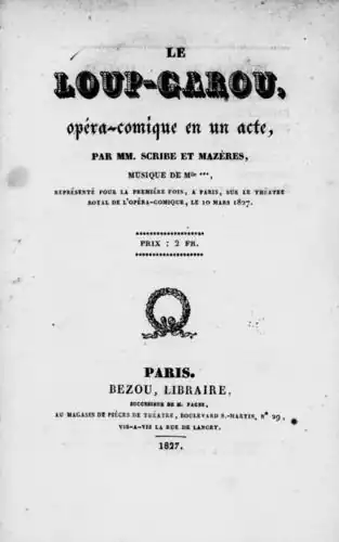 ![]() Title page of the published libretto of Le loup-garou (Paris: Bezou, 1827) | |