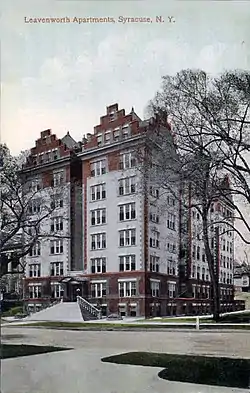 Leavenworth Apartments is a historic apartment building located in the Near Northeast neighborhood of Syracuse, Onondaga County, New York. It was designed by architect Charles Erastus Colton and built in 1912. It is a seven-story, Colonial Revival style asymmetrical building in six sections. It is a steel frame and masonry building with cast stone details. The building features stepped gable ends. It is located across from the New Kasson Apartments built in 1898.[2]: 3