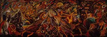 Lebanon is a mural size painting by Nabil Kanso depicting the Lebanese Civil War in a scene invoking the spirit and character of the people in the midst of horror and violence gripping the country.[1] Amid the scene of chaos and devastation, two central figures reach across toward each other symbolically to represent the appeal for unity in defiance of the forces of division, destruction, and terror.[2][3]