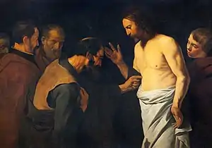 Three paintings are with certainty attributed to van der Cooghen, the Doubting Thomas (signed and dated 1654, Mauritshuis), the Adoration of the shepherds, (signed and dated 1656, Frans Hals Museum ) and the Constance (Preciosa) abducted by gypsies (1650s, formerly in the Bailey Art Museum in Charlotteville, Virginia).[1] The latter work was inspired by the story popularised in Cervantes' novella La gitanilla ("The Little Gypsy Girl') first published in 1613. It tells the story of the noble girl Preciosa who is abducted and raised by a Roma family. The nobleman Don Juan falls in love with her and finally her true high birth is discovered. The story was transposed by the Dutch poet Jacob Cats in verse in his Het Spaense Heydinnetje ('The Spanish heathen girl') published in 1637. This theme was very popular in Dutch 17th-century art. While most Dutch painters treated either the moment of Don Juan's first encounter with Preciosa or the revelation of her true identity, van der Cooghen painted the moment in which the girl is abducted by the Roma family. As was common in depictions of the period, he contrasts the white skin of the baby girl with those of the darker skinned Roma.[9] The large figures in his painting of the Doubting Thomas betray the influence of his teacher Jacob Jordaens. The painting is based on the story in the New Testament which recounts of the apostle Thomas who expresses doubts that the person he sees in front of him is truly Jesus who has arisen after his crucifixion and death. Jesus allows him to touch the wound in his side to prove he is really Jesus. This story was popular with Catholics during the Counter Reformation. While Protestants believe that a person can be 'saved' only through faith (sola fide), Roman Catholics liked to go back to this story which highlights how the Jesus character in the story was ready to provide tangible evidence to a doubting person like Thomas.[10]